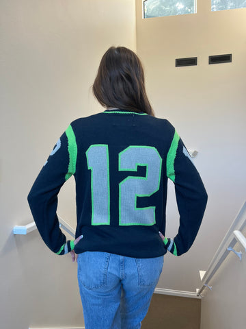 Navy Seattle Tribute Sweater with "12" and Green V-Neck (UNISEX SIZING)