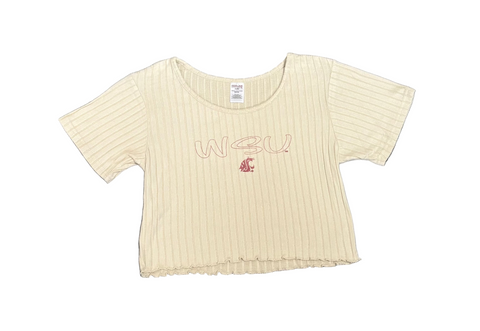 A light cream Hollis Short Sleeve tee designed for women, featuring a flattering scalloped bottom edge and soft, comfortable fabric. Finished with Washington State University branding, it’s a stylish way to show Cougar spirit in an easygoing, feminine silhouette.